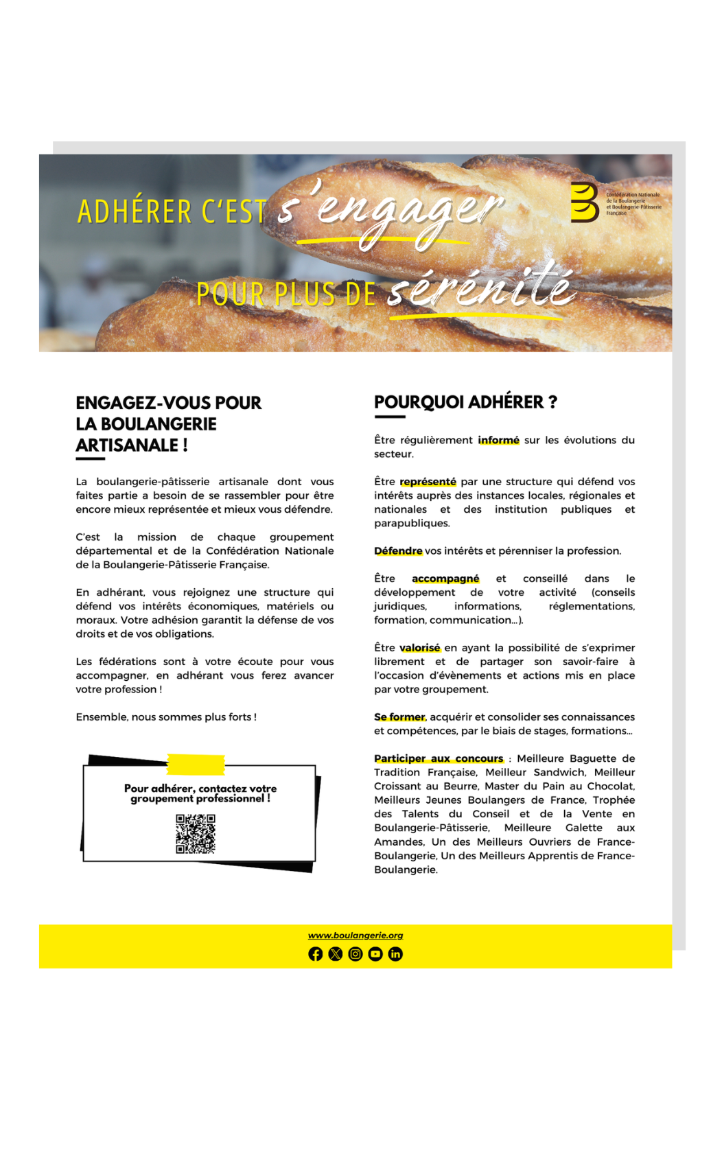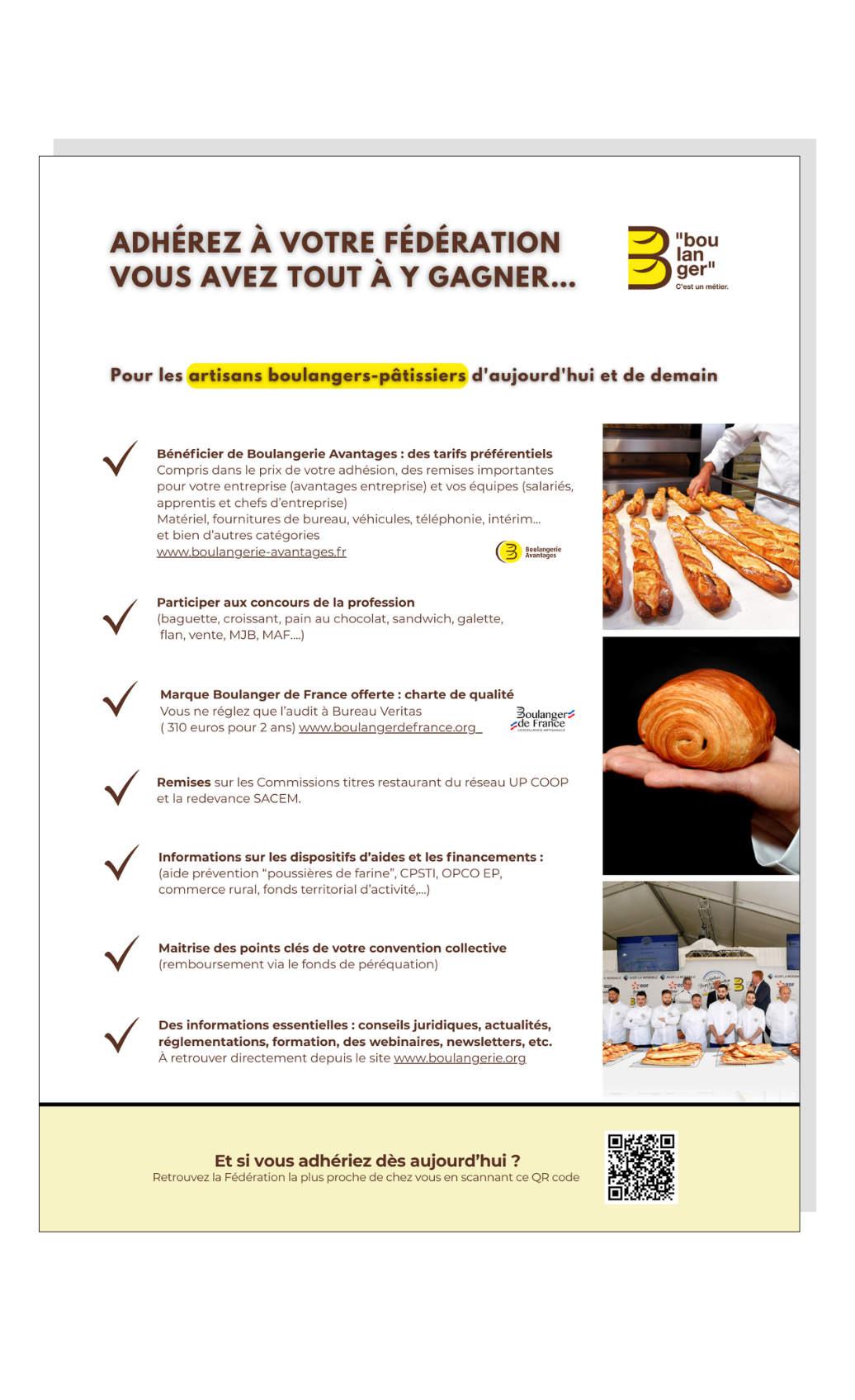 - Être valorisé notamment en participant à des actions collectives de promotion du métier et du secteur (Fête du Pain, Galettes…), à des salons, des forums et concours professionnels et de faire entendre votre voix lors de réunions.